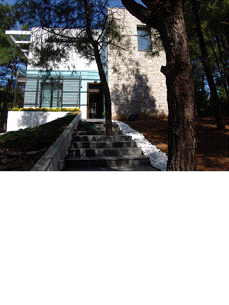 Τα επιμήκη μαρμάρινα σκαλοπάτια πλάτους 1,50 μ., αναπτύσσονται από την είσοδο του οικοπέδου, ενσωματώνουν τα δύο πεύκα που φωτίζονται στη βάση τους και οδηγούν τον επισκέπτη στην κύρια είσοδο του σπιτιού.Το ξύλο το γυαλί και η πέτρα κυριαρχούν στις όψεις της κατοικίας,που συμπληρώνονται με τις κυλινδρικές ανοξείδωτες υδρορρόες.Η ανάπτυξη των εσωτερικών χώρων γίνεται σε τρία επίπεδα:στο υπόγειο,με το κλειστό parking,τον ξενώνα και τους αποθηκευτικούς χώρους ,στο ισόγειο με την κουζίνα και τους χώρους υποδοχής και στον όροφο με τα υπνοδωμάτια και ένα μικρό γραφείο-βιβλιοθήκη.Αυτό το τελευταίο τοποθετείται στο εσωτερικό μπαλκόνι του ορόφου και επιτρέπει στο χώρο του τζακιού στο ισόγειο να αναπτυχθεί σε διπλό ύψος εξαίροντας με αυτό τον τρόπο την όψη του τζακιού.Τα παράθυρα εκατέρωθεν κοιτούν στο πίσω μέρος του κήπου όπου έχει γίνει πρόβλεψη για την κατασκευή πισίνας.